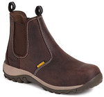Full grain brown waxy leather upper. Elasticated sides with two woven pull loops front & rear. Steel toe cap protection steel midsole protection. Comfort insole. Phylon/rubber outsole. A modern styled dealer boot from DEWALT.